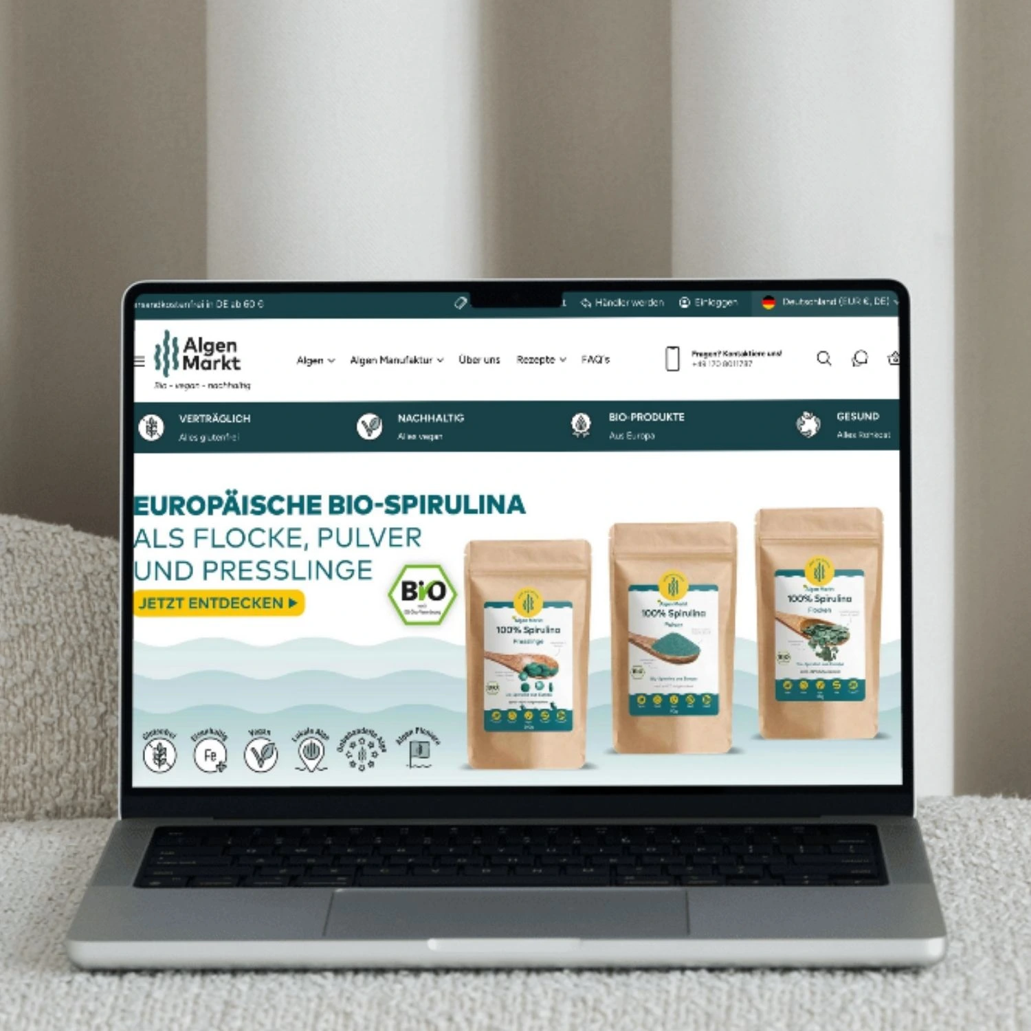 Wir konnten bei Algenmarkt durch einen Shopumzug von Wordpress auf Shopify die Sichtbarkeit verdoppeln und die Conversion Rate deutlich verbessern durch ein modernes Design und einen sauberen technischen Umzug.